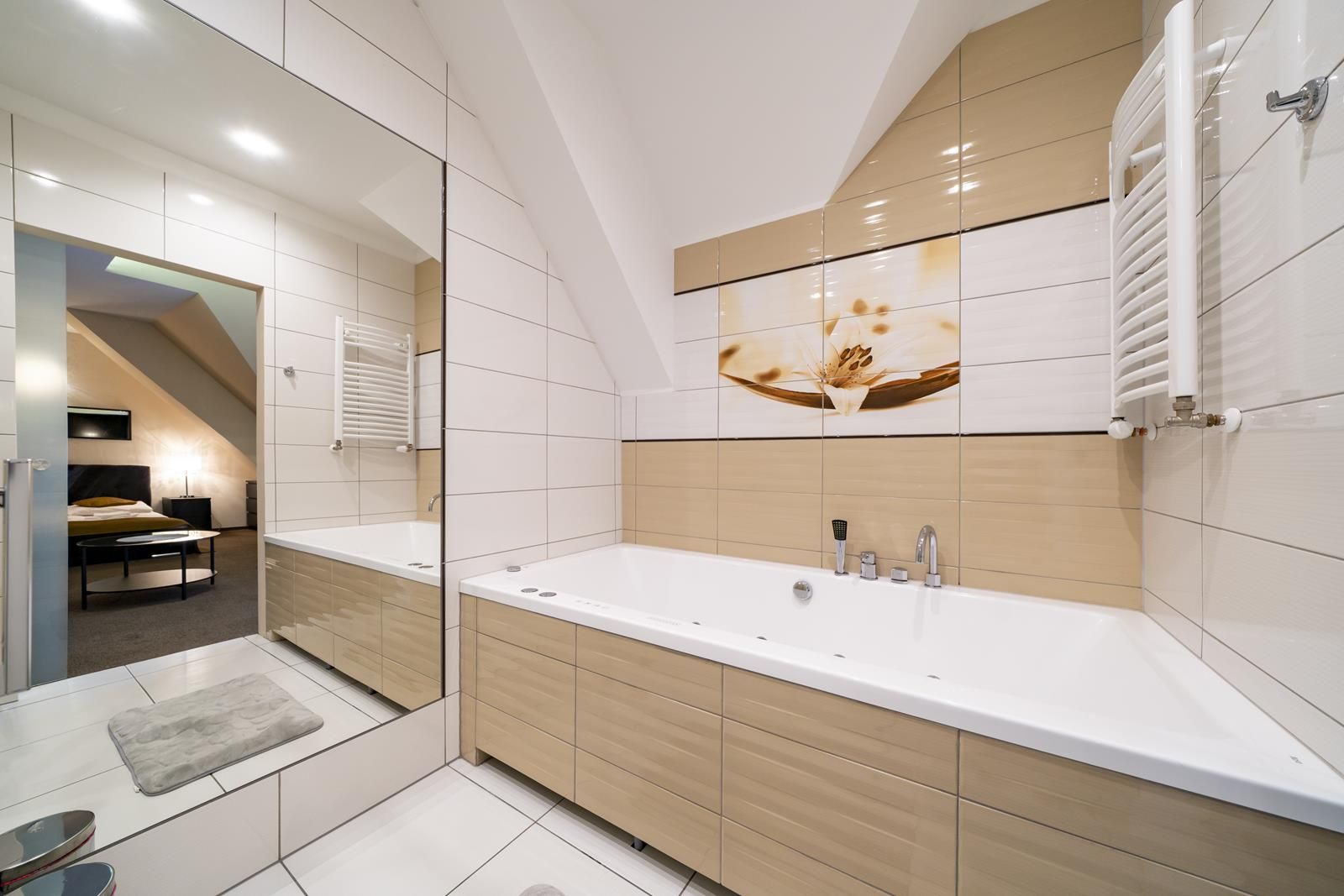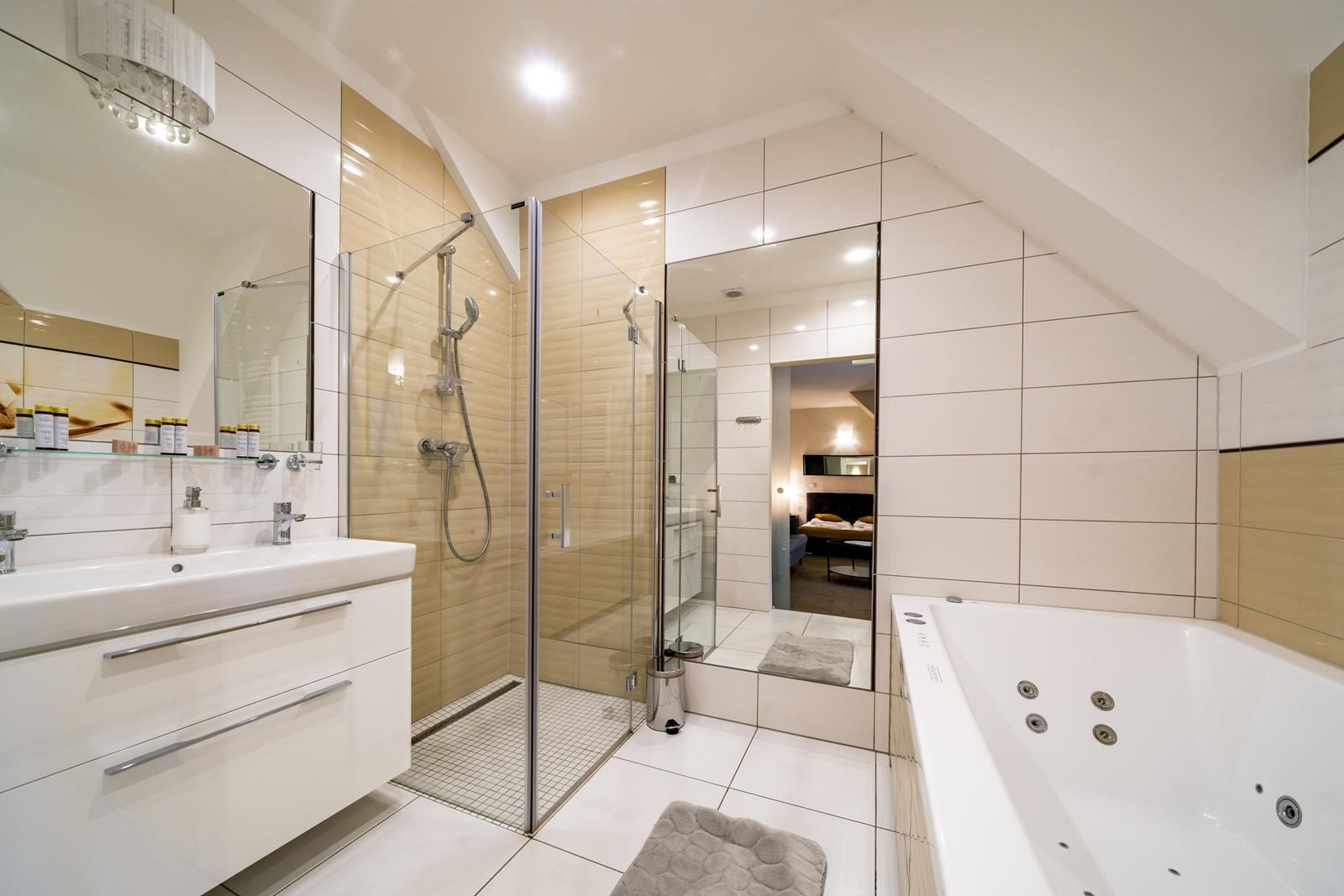 Ekskluzywny apartament małżeński z własnym tarasem poza kabina prysznicową posiada również wannę z hydromasażem.