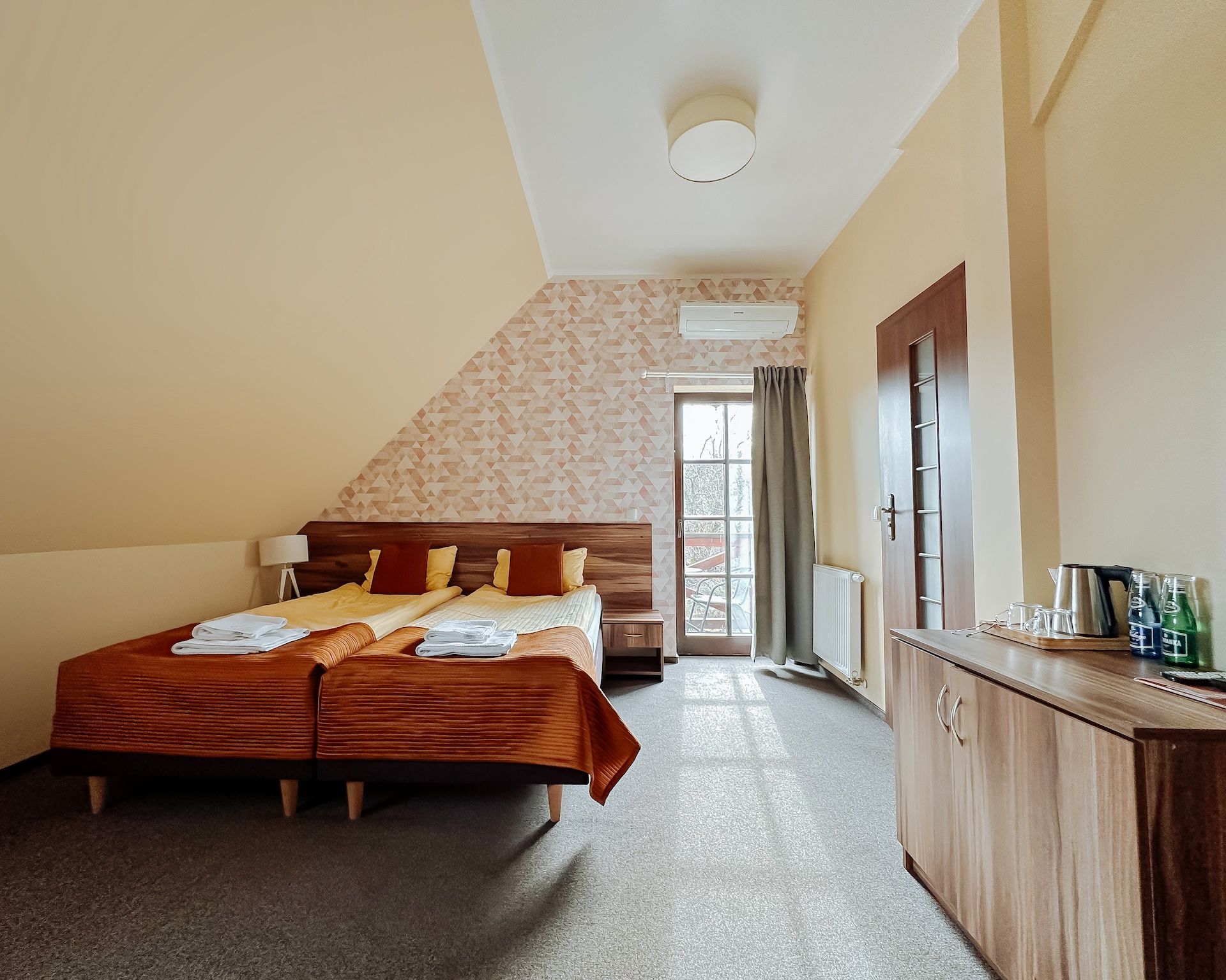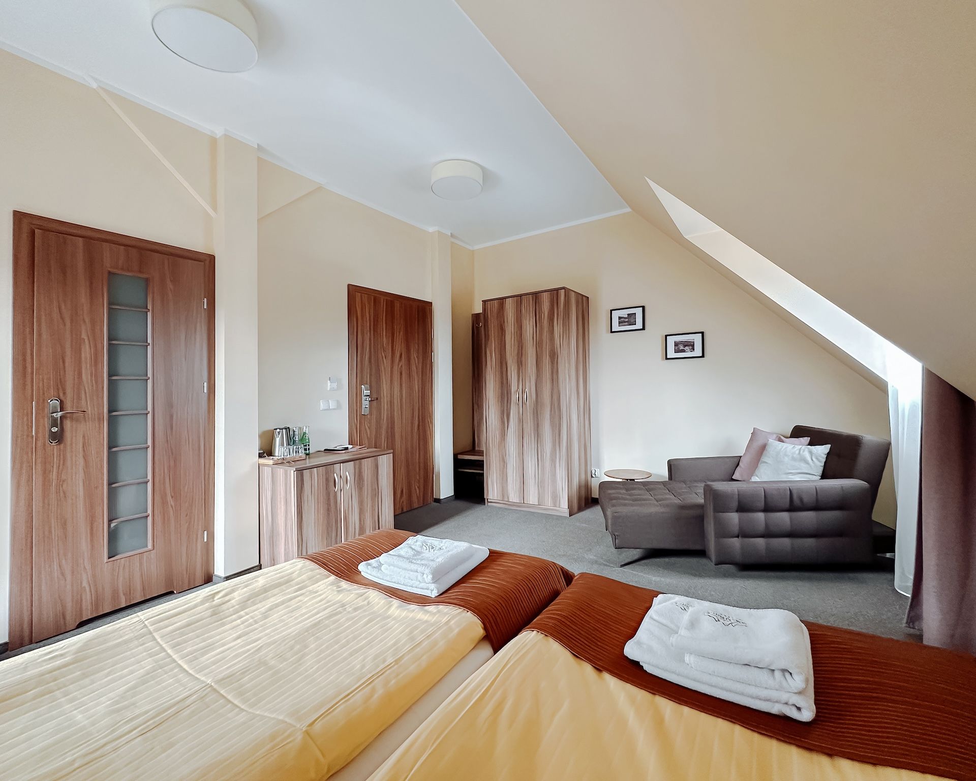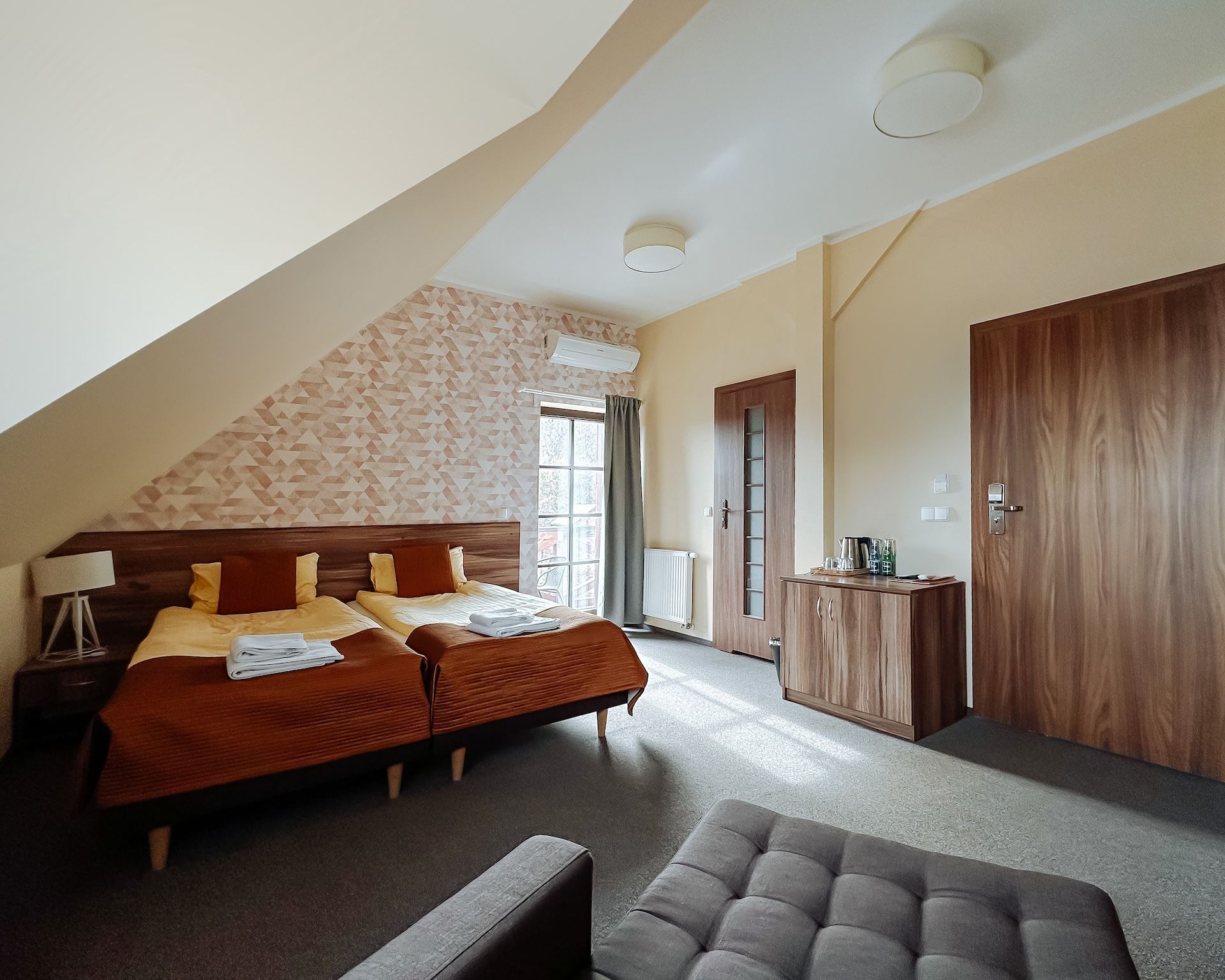 Nasze pokoje zostały wyposażone w nowoczesne łazienki oraz komfortowe łózka. Wszystkie posiadają klimatyzację, telewizor, mini lodówkę, biurko, szafę, komodę, szafki nocne, ręczniki, zestaw kosmetyków a także bezpłatny dostęp do internetu bezprzewodowego oraz parkingu.