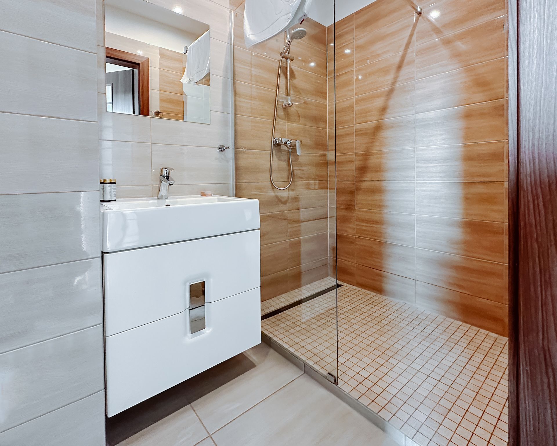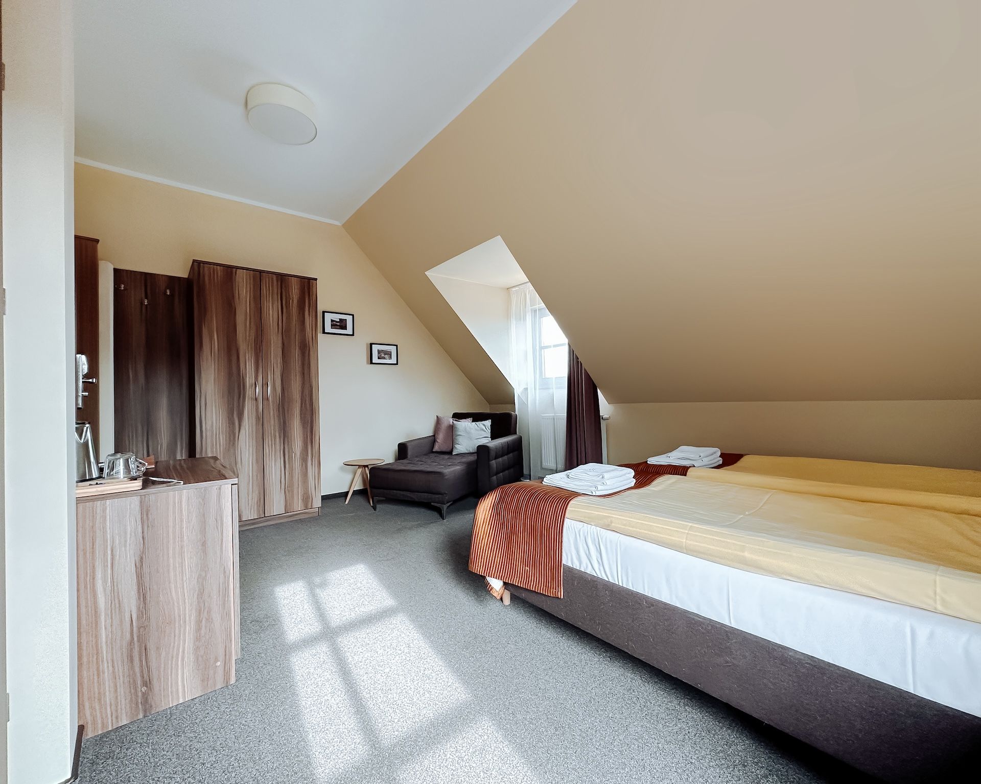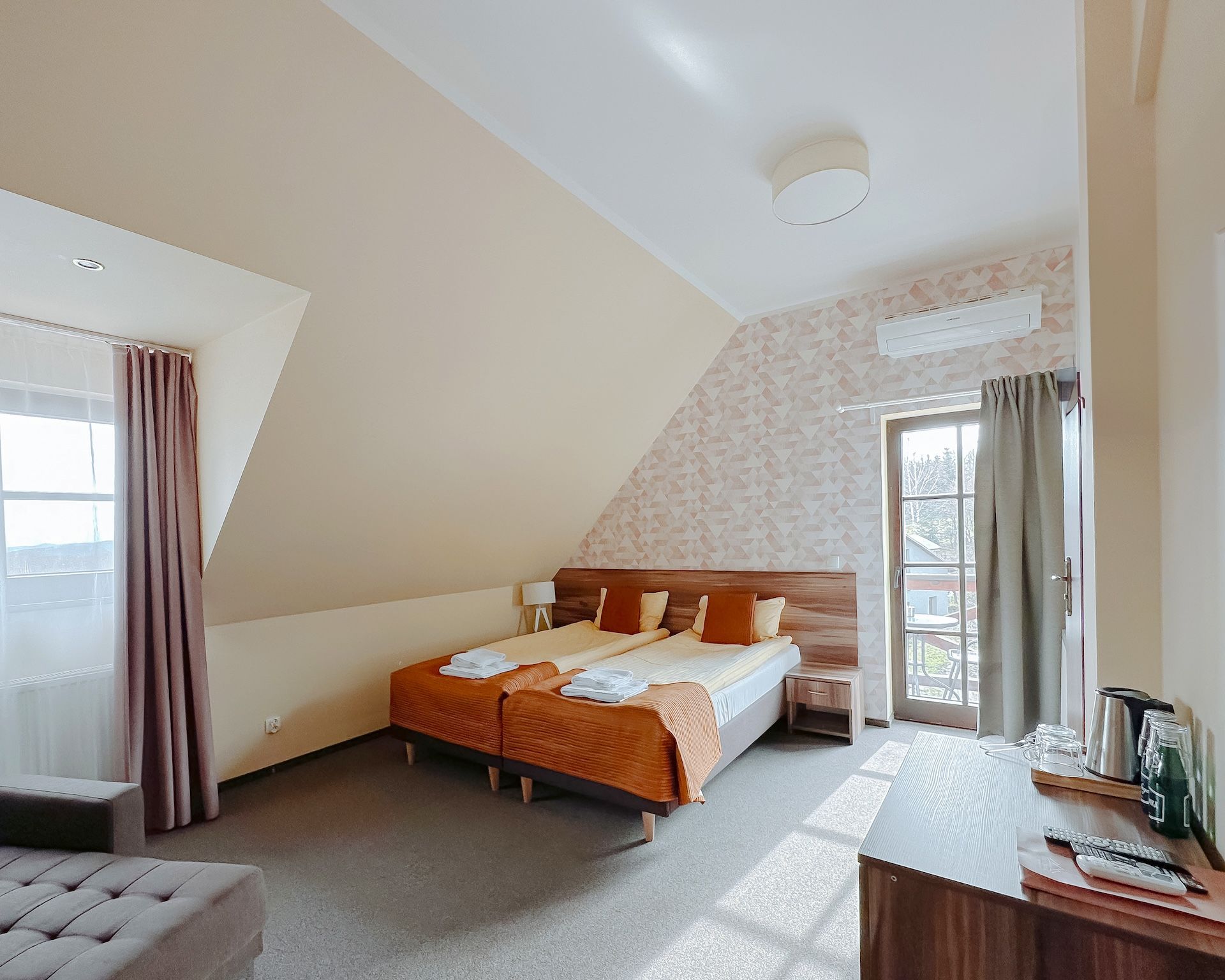 Nasze pokoje zostały wyposażone w nowoczesne łazienki oraz komfortowe łózka. Wszystkie posiadają klimatyzację, telewizor, mini lodówkę, biurko, szafę, komodę, szafki nocne, ręczniki, zestaw kosmetyków a także bezpłatny dostęp do internetu bezprzewodowego oraz parkingu.